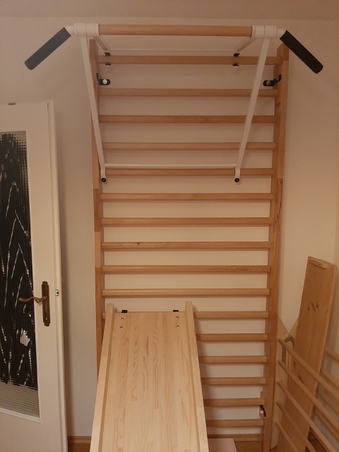 - inkl. Wandbefestigungsmaterial (Abstandhalter, Winkel, Schrauben und Dübel). Auf Wunsch versenden wir die Sprossenwand mit 2 Holzleisten (Montage Bretter), 33 mm Wandstärke. Ohne Zusatzkosten.