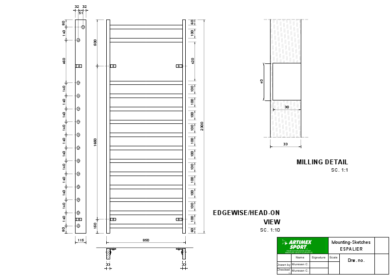 Espalderas para ejercicios de gimnasia. Los elementos verticales están fabricados en madera de Flandes de2000 x130x33 mm.