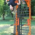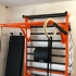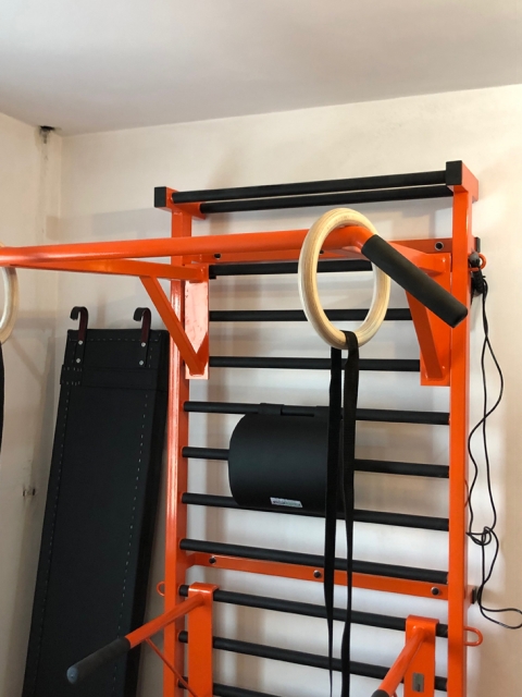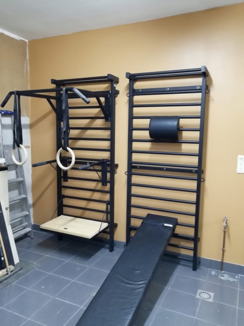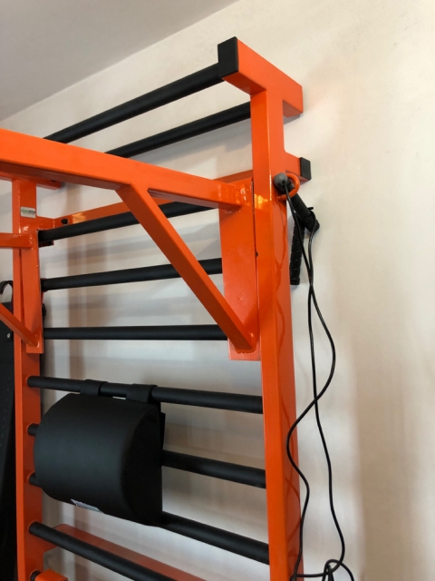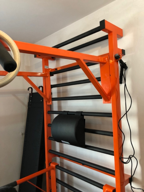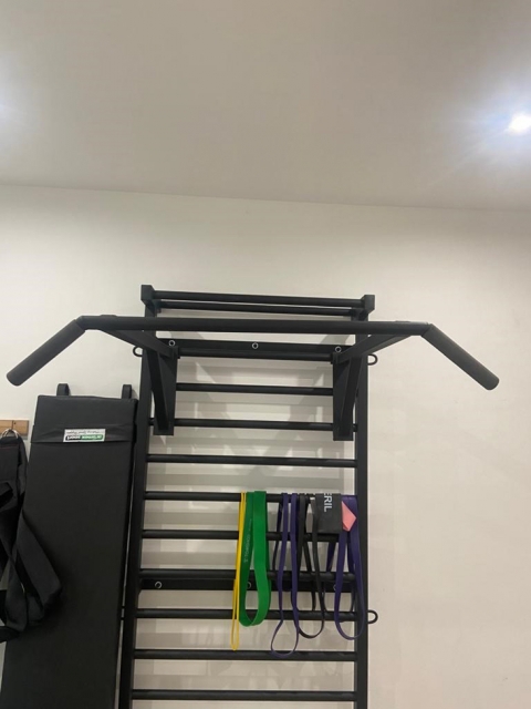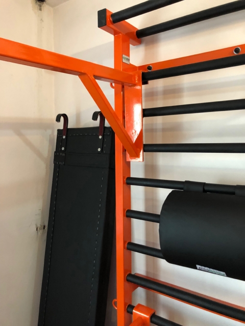 On monte la barre sur l'espalier de gymnastique à n'importe quelle hauteur.