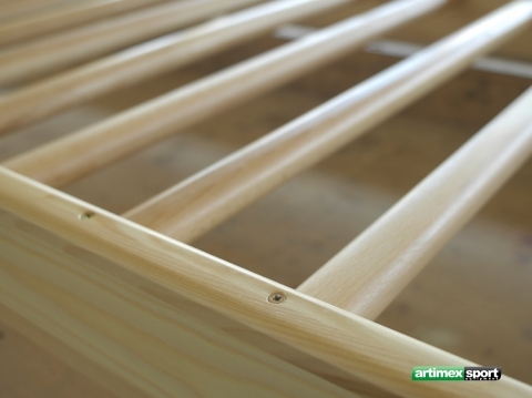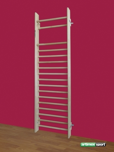 Espalier de bois laqué, idéal pour salles de sport, salles de rééducation ainsi que fitness. Les barres latérales de l'espalier sont réalisées en bois de sapin stratifiées et les barres horizontales rondes en nombre de 17 sont réalisées en bois de hêtre, section Ø 40x30 mm.