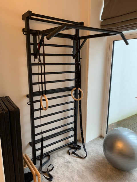 La spalliera è costituita da una singola campata con 17pioli ovoidali, del diametro di 30 mm e distanziati 140 mm uno dall'altro, tranne tra i primi due pioli superiori e il terzo dove la distanza è di 260 mm, e provviste di 6 anelli (3 per parte) per l'ancoraggio di accessori come il TRX.