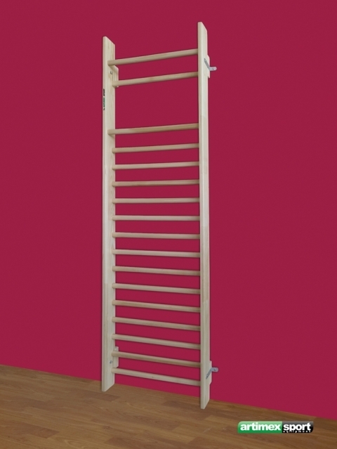 Spalliera svedese a campata singola, in legno di faggio e d'abete verniciato, con staffe angolari in acciaio.